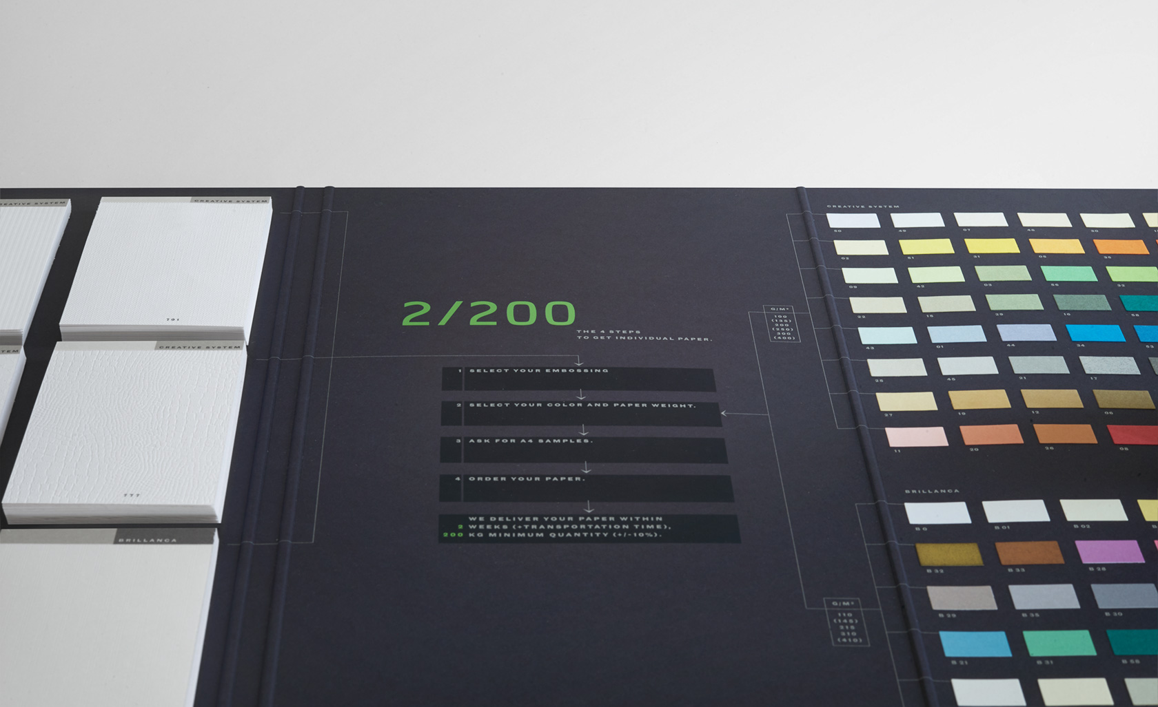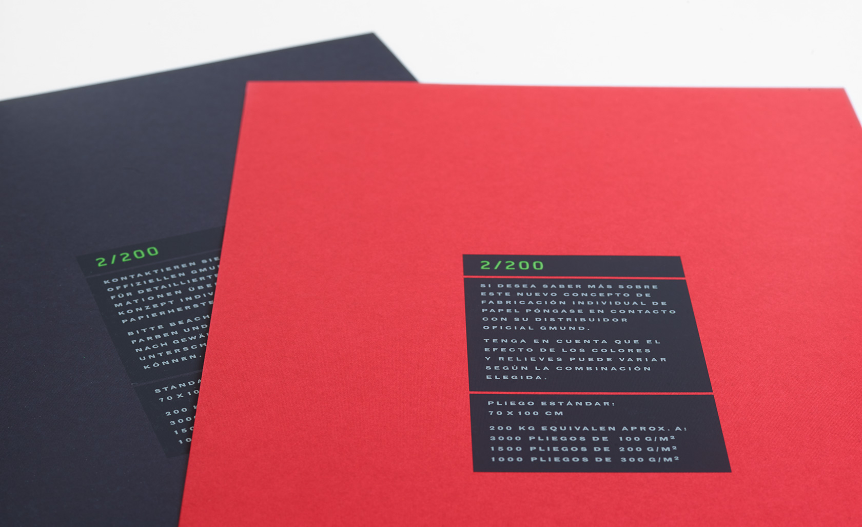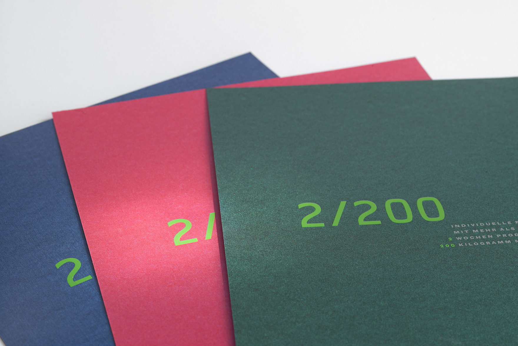 Für die Büttenpapierfabrik Gmund in Gmund am Tegernsee haben wir diverse Papierkollektionen realisiert. So zum Beispiel Gmund Colors, Transparence, Money, Worldline und andere. Hier ist das Papiersystem 2/200 gezeigt. 2/200, das heisst: 200 Kilogramm Papier, hergestellt nach individuellen Wünschen des Kunden, geliefert innert 2 Wochen nach Bestellungseingang. Aus einer riesigen Auswahl an Papierfarben, Papiergewichten, Oberflächenstrukturen und Veredelungen ergeben sich über 100 000 mögliche Kombinationen. Wir gestalteten ein grossformatiges Musterbuch, das die unzähligen Varianten und das Bestellverfahren auf einen Blick zeigt. Der Kunde soll sich auf möglichst einfache Art orientieren und seine eigene Papierkombination auswählen können. Zusätzlich zum Musterbuch produzierten wir viele Werbemittel, Promotionen und Messeunterlagen in diversen Sprachen: Musterbuch, Mappe mit Druckmustern, Musterfächer, Random Cards Beihefter, Banner.
