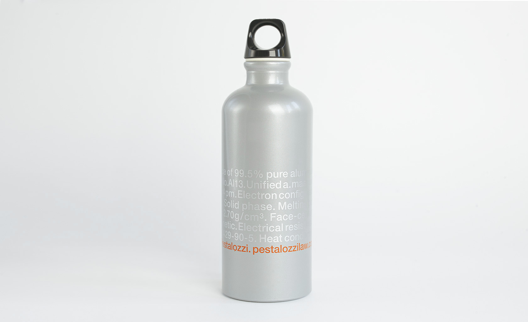 Pestalozzi, Attorneys at Law ist eine der grössten Anwaltskanzleien der Schweiz. Im Auftrag von apparence ag haben wir eine Reihe von Give Aways zum hundertjährigen Bestehen der Kanzlei entwickelt. Hier zu sehen: Die Sigg Flasche mit dem Aufdruck des Herstellverfahrens und der Beschaffenheit des verwendeten Materials. Wir lieben es, der Sache auf den Grund zu gehen, so werden das verwendete Material und das Herstellungsverfahren der Flasche selbst zur Botschaft: gründliche Information, Genauigkeit und Forschungstrieb.
