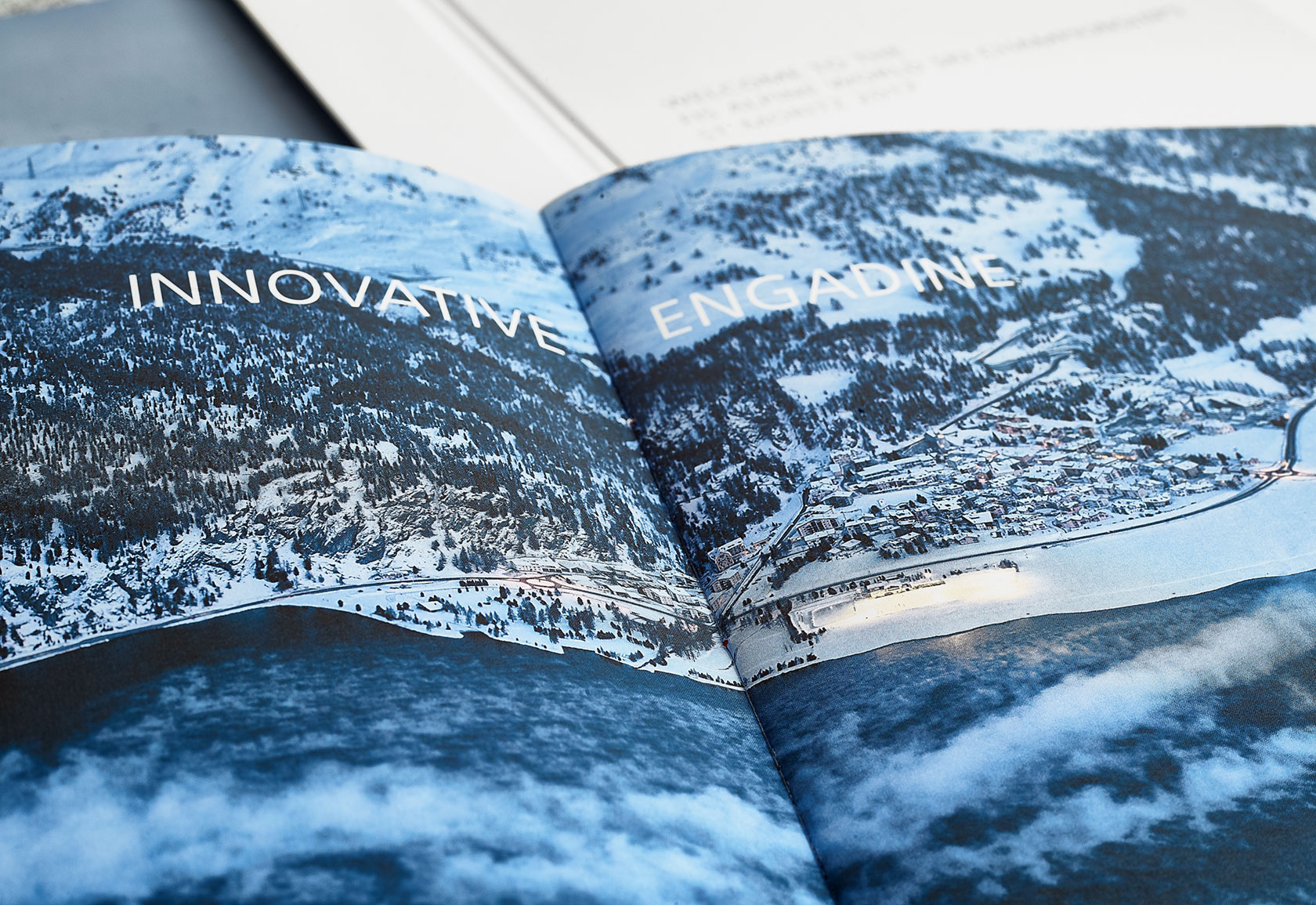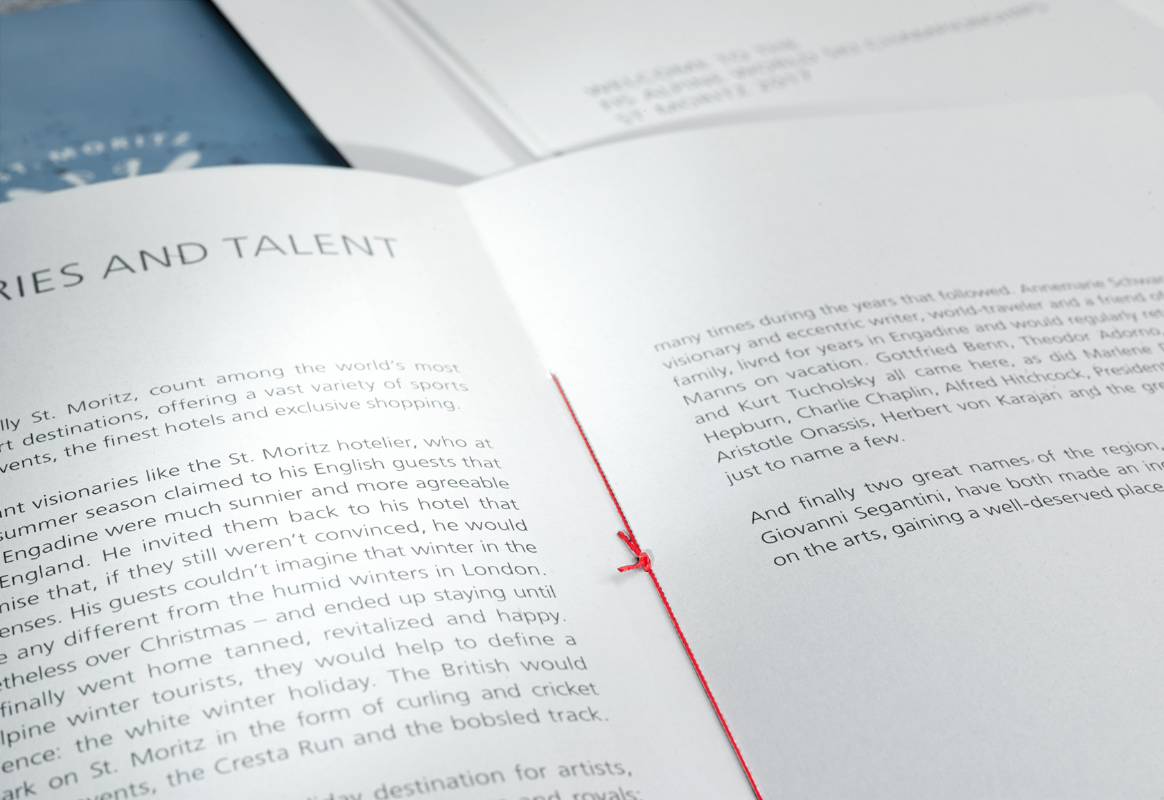 Das Package haben wir bewusst leicht und schlicht gestaltet. Dafür aber Engadiner Granit als Zusatzmaterial verwendet. Also einfach lokales Material statt ornamentalem Alpine Look, schlichter Stein statt dekorativem Edelweiss. Alles ist weiss, kühl und frisch wie Schnee im Gebirge. Das Package enthält 2 Broschüren mit Fadenheftung: Eine für alle Informationen zum Event, eine zweite mit spannenden Informationen zum Engadin, seiner Geschichte und seiner Besonderheiten. Es geht also nicht nur um den Event, sondern weckt auch das Interesse am Ort, seiner Geschichte seinen Leuten, und mehr.