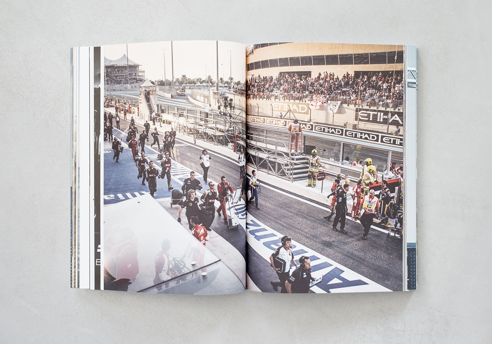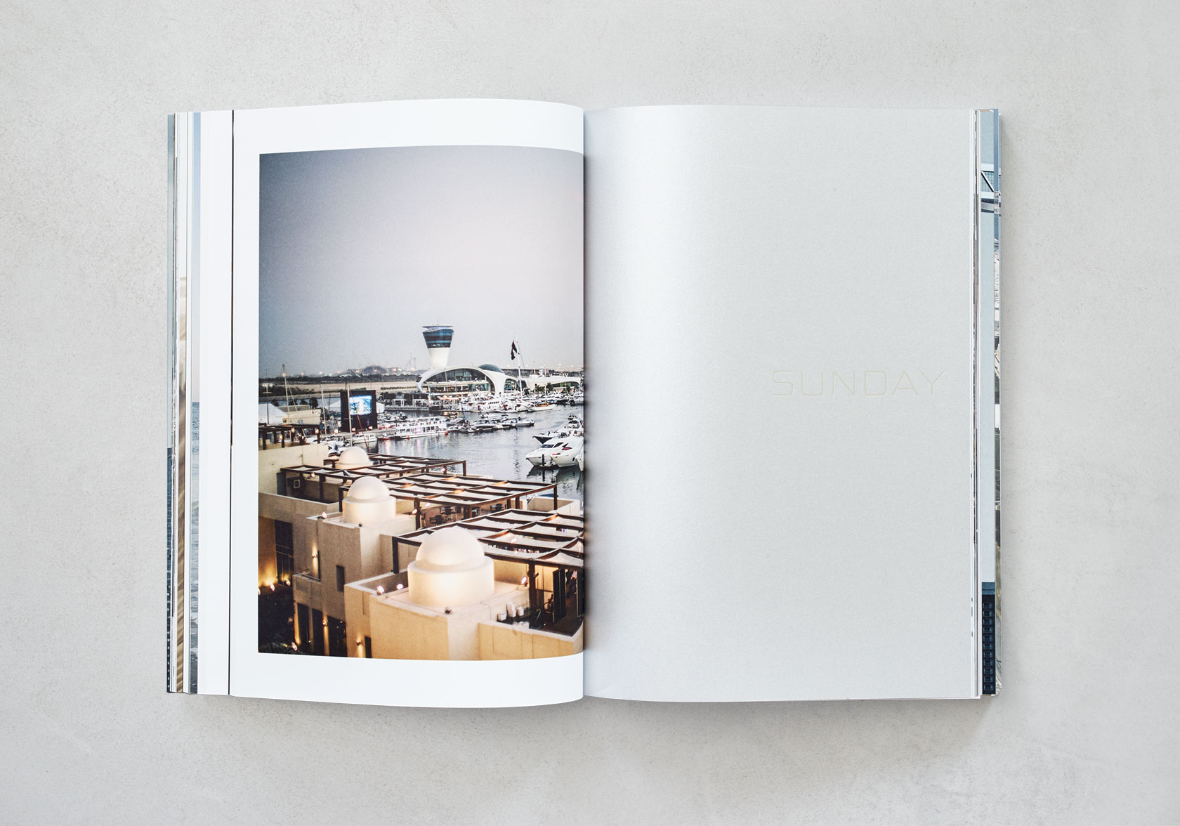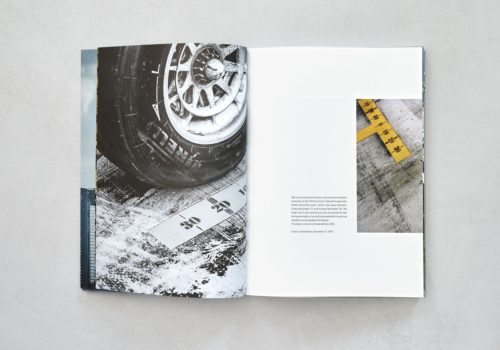 Im Rahmen des Formula 1 Abu Dhabi Grand Prix fand ein Event statt. Dieser wurde vom Fotografen Alberto Venzago begleitet und fotografisch dokumentiert. Wir haben daraus ein Buch gestaltet, dieses wurde als Präsent einen Monat nach dem Event an alle Gäste verschickt oder abgegeben. Die Gestaltung ist bewusst schlicht und unprätenziös. Statt opulentem und schwerfälligem Machwerk entschieden wir uns für ein leichtfüssiges Paperback im Format und in der Anmutung eines Magazins oder Bildbands.
