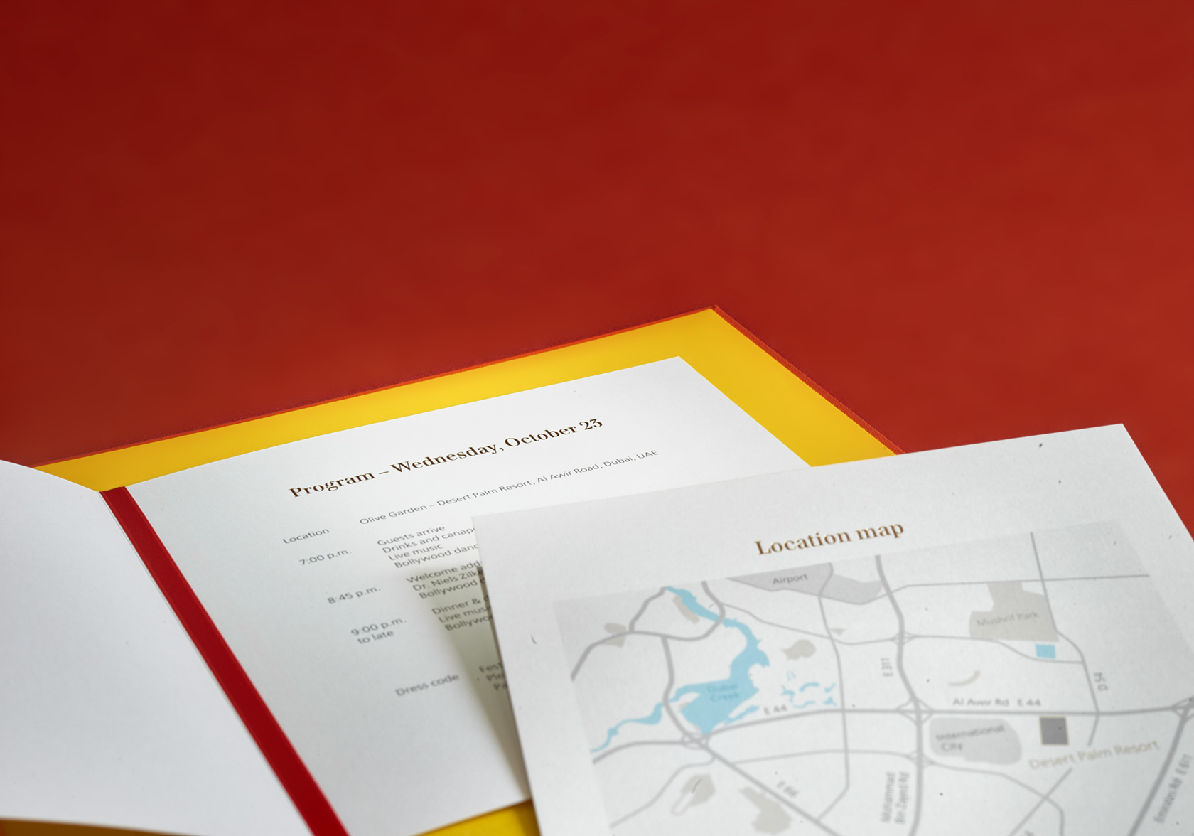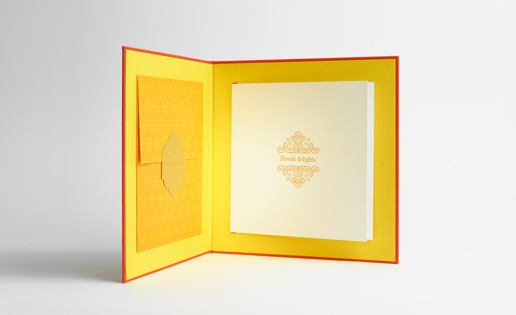 Diwali, das Lichterfest, ist ein bedeutendes mehrtägiges hinduistisches Fest in Indien, Sri Lanka und Nepal und in anderen vom Hinduismus geprägten Ländern, zum Beispiel in Mauritius, Suriname, Fidschi, Trinidad und Tobago, Singapur sowie in Südafrika und der indischen Diaspora. Das Fest kann auf Grund seiner spirituellen sowie sozialen Bedeutung und seines fröhlichen Charakters mit Weihnachten verglichen werden. In Nordindien ist Diwali gleichzeitig der Neujahrstag. Für indische Gäste in Abu Dhabi haben wir im Rahmen des Divali Dinners eine Einladung realisiert. Bestehend aus Mappe, persönlichem Einladungsschreiben, Programm Folder und Anmeldekarte. Die Mappe ist mit Gewebe überzogen und geprägt. Innen kamen Siebdruck, Heissfolie und Digitaldruck zur Anwendung.