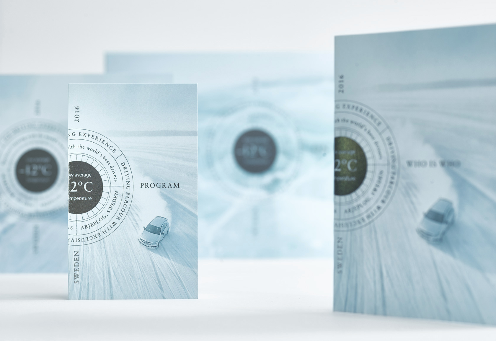 Event in Arjeplog, Schweden. Mercedes AMG bietet die Infrastruktur und die Fahrzeuge für einen speziellen Ice Driving Event. Auf dem gefrorenen See von Arjeplog werden die Gäste ans fahrerische Limit geführt. Die F1 Weltmeister Mika Häkkinen oder Nico Rosberg geben ihr Wissen an die Gäste weiter und erweitern so deren Können und Kompetenz am Steuer - auf Eis. Wir gestalteten die persönlichen Einadungspackages für die Gäste, bestehend aus Folder, Program Broschüre, Einladung, RSVP und weiteren Materialen. Für den Anlass selber sind es Welcome Cards, Pocket Programs, Menu Cards und mehr.
